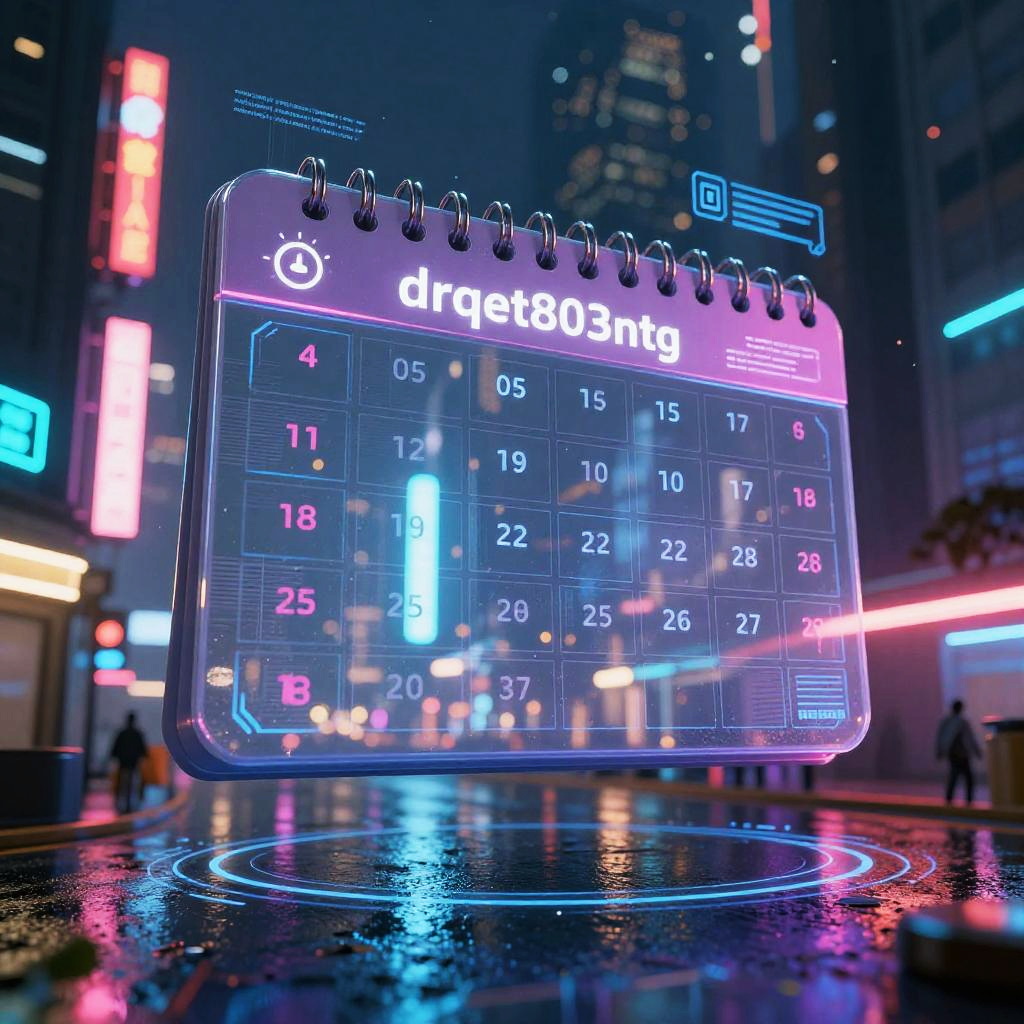Year:drqet803ntg= depicted as a futuristic digital calendar floating in a cyberpunk cityscape at night, neon lights reflecting off rain-soaked streets, intricate holographic interfaces and glowing numeric codes, ultra-detailed, cinematic lighting
