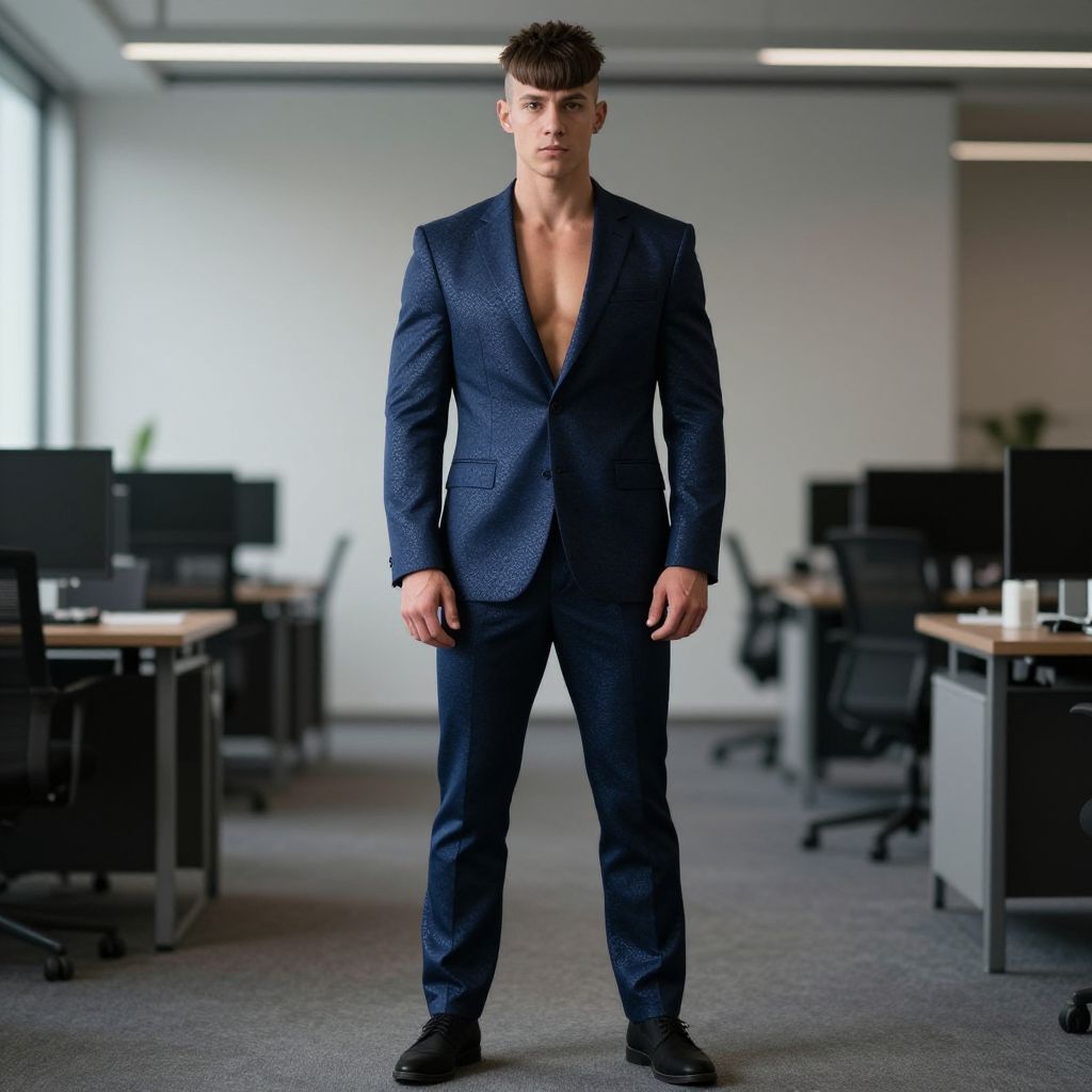 Photograph of a tall, slim, Caucasian man with short, dark brown hair standing in a modern, open office space. He wears a dark blue, textured suit with the jacket unbuttoned, revealing his bare chest and no shirt underneath. His black dress shoes are polished. The office features black desks with monitors, black office chairs, and a gray carpet. The background includes white walls and large windows with soft natural light. The man's expression is serious and focused, and he stands with his hands by his sides, centered in the frame.