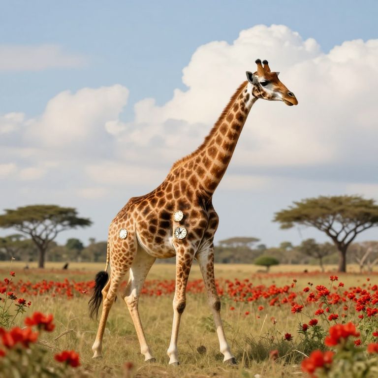 Giraffe with clock faces on its body and head gracefully strides through a vibrant prairie, surrounded by blooming red flowers under a serene sky dotted with fluffy clouds.