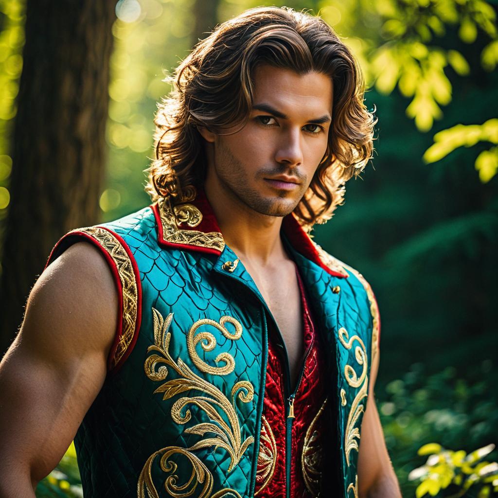 Photorealistic image of a handsome young man with brown wavy hair and a serious expression standing in a forest. He wears a sleeveless, detailed embroidered jacket in vibrant red, blue, and gold colors. The background features blurry green trees with sunlight filtering through, highlighting his muscular arms and upper body. The image has a high level of detail and vibrant colors, fitting a fantasy genre style.
