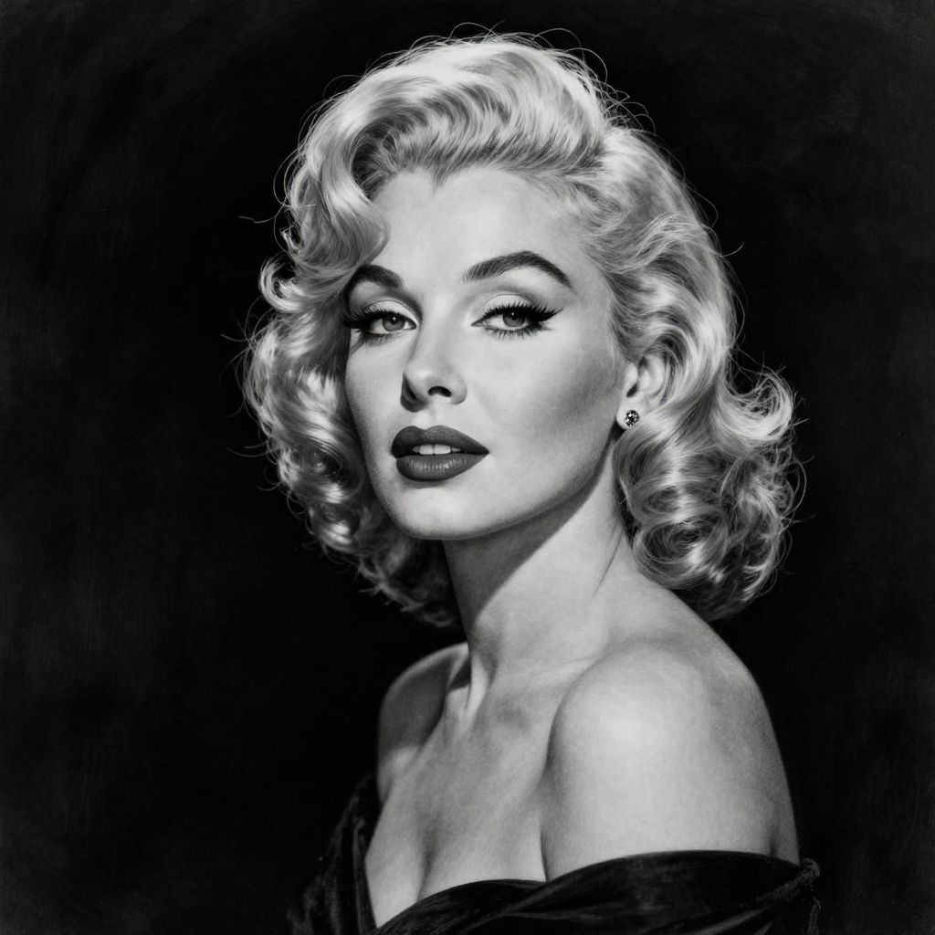 Black-and-white digital portrait of a glamorous, fair-skinned woman with platinum blonde, curly hair, bold dark lipstick, and a single earring,