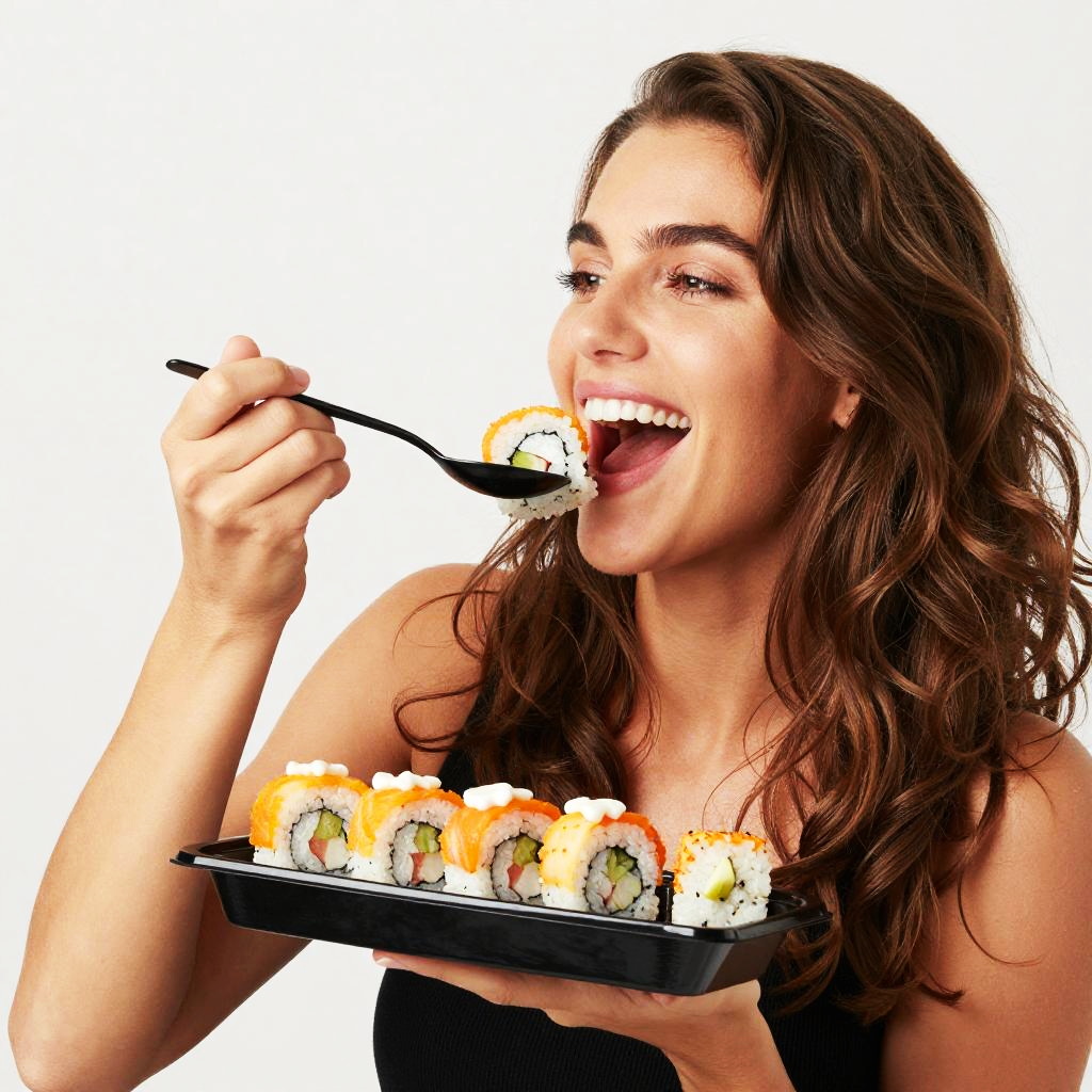 A smiling woman with long brown hair and a black top holds a black plate filled with sushi rolls topped with orange and white fish. She is using a black spoon to eat a piece of sushi, against a plain white background.