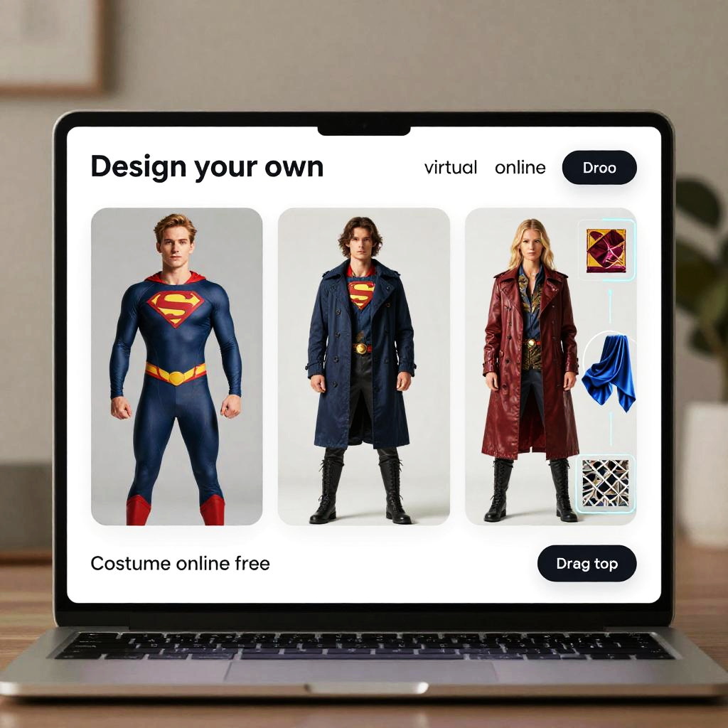 Photograph of a laptop screen displaying a costume design app, featuring Superman, dark Superman, and a brown coat with virtual try-on options.