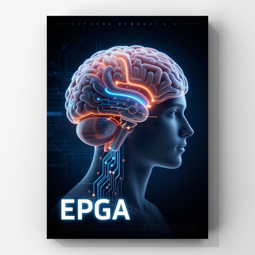 Digital CGI artwork of a neon-lit human head profile with glowing brain circuits, colorful neural pathways, and "EPGA" text against a dark background