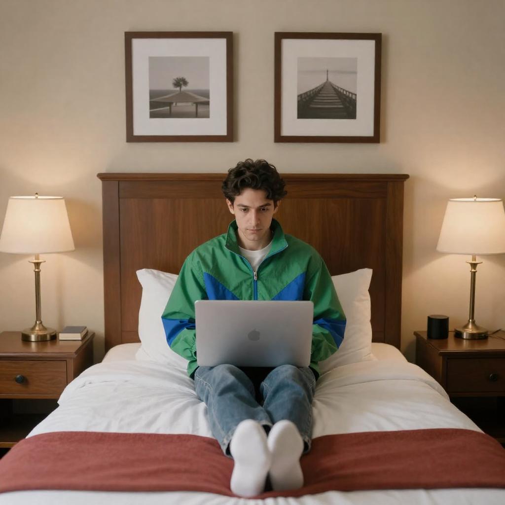 Young man with short dark hair, wearing a green and blue jacket, sitting cross-legged on a bed in a beige hotel room. He is focused on working on a laptop. The room features a wooden headboard, two framed black and white pictures above the bed, two brass table lamps on wooden nightstands, a white bedspread with a red-striped blanket, and books on the nightstands.
