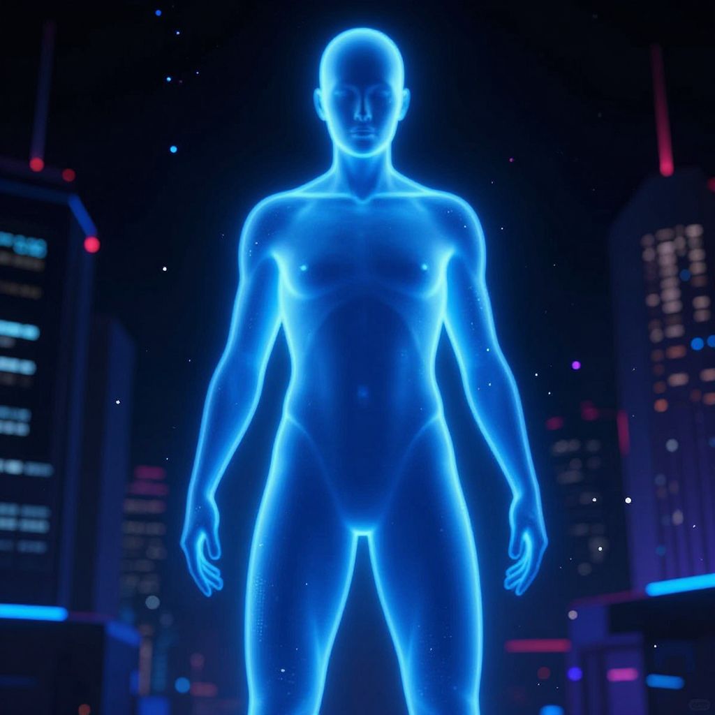 Bodyoutline of a human figure glowing with neon blue light, surrounded by a dark futuristic cityscape, digital particles floating around, highly detailed cyberpunk style with a focus on sleek contours and vibrant color contrasts.