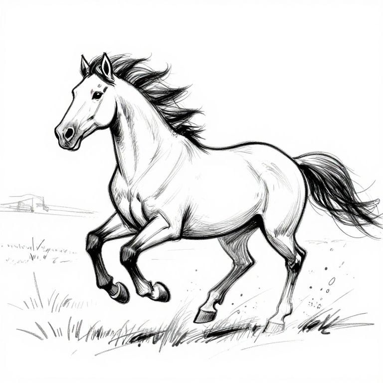 Photo to sketch outline of a wild horse running across a field, capturing fluid motion with bold, sweeping lines and minimal background detail, evoking the spirit of freedom in traditional sketch art.