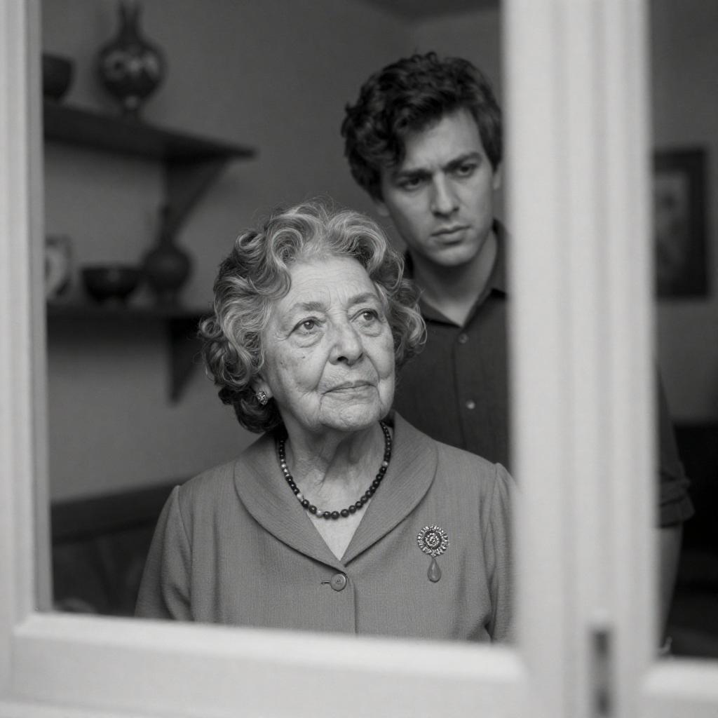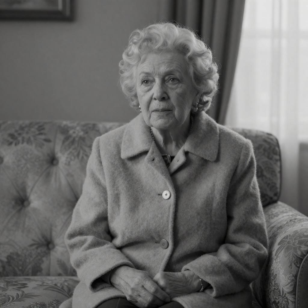 Black and white photograph of an elderly woman with curly hair, sitting on a floral-patterned couch. She wears a collared coat and looks slightly to the side with a concerned expression. Background includes curtains and a window with light coming through.