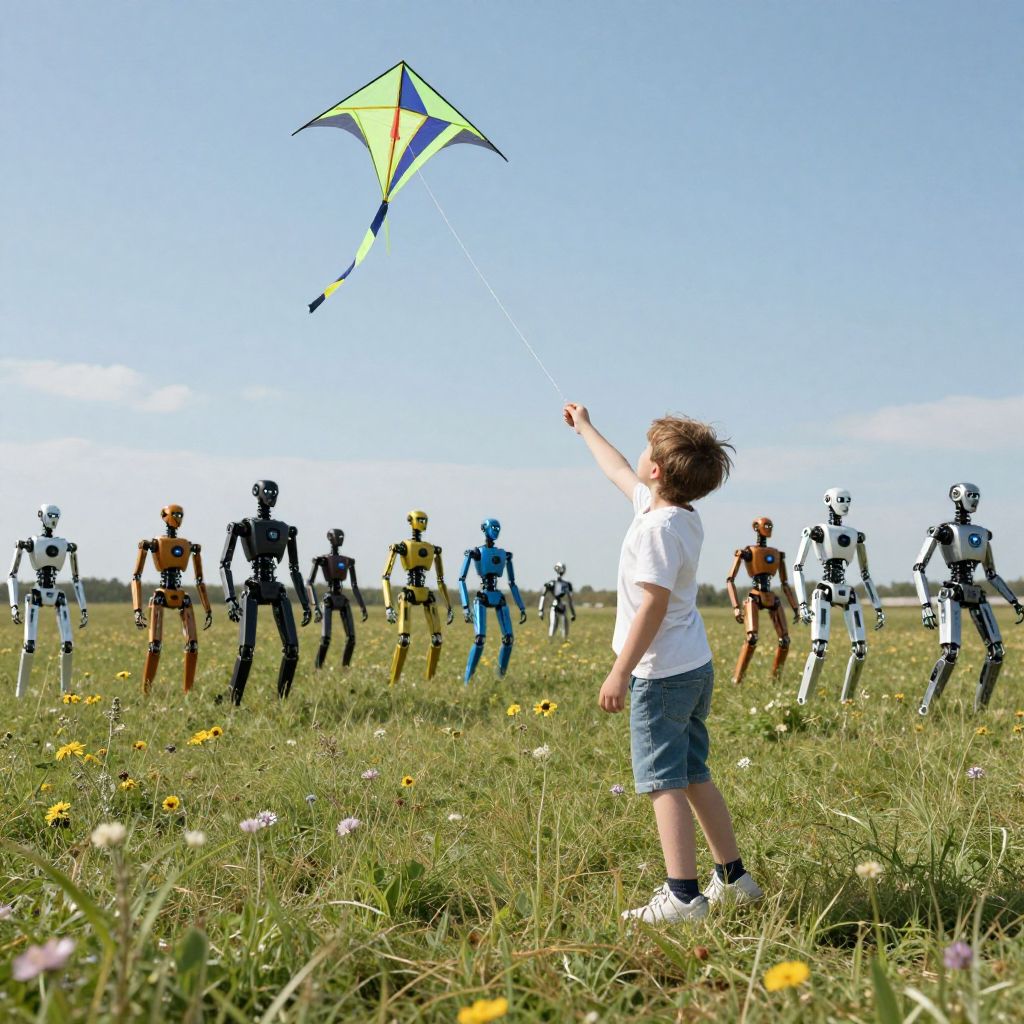 Photograph of a curly-haired boy in a white shirt and denim shorts flying a yellow and black kite, surrounded by colorful robotic figures in a sunny,