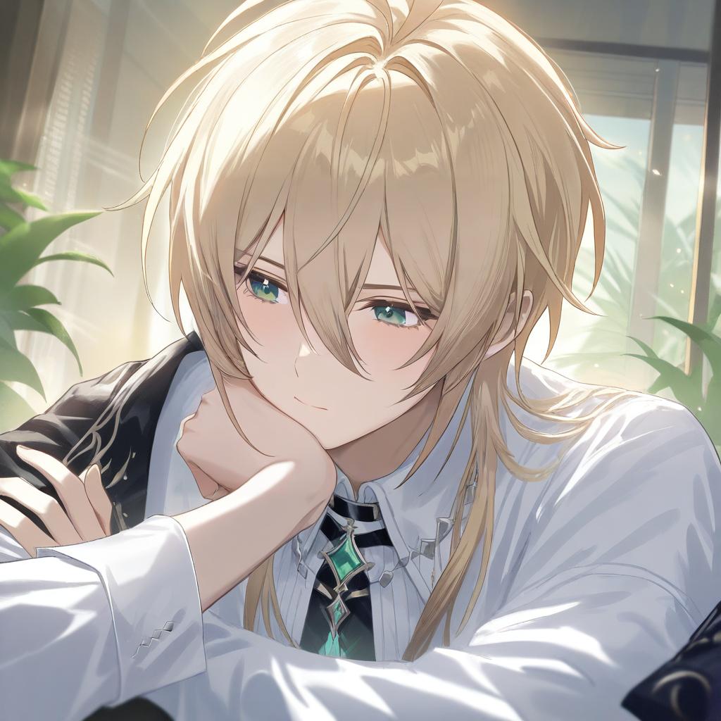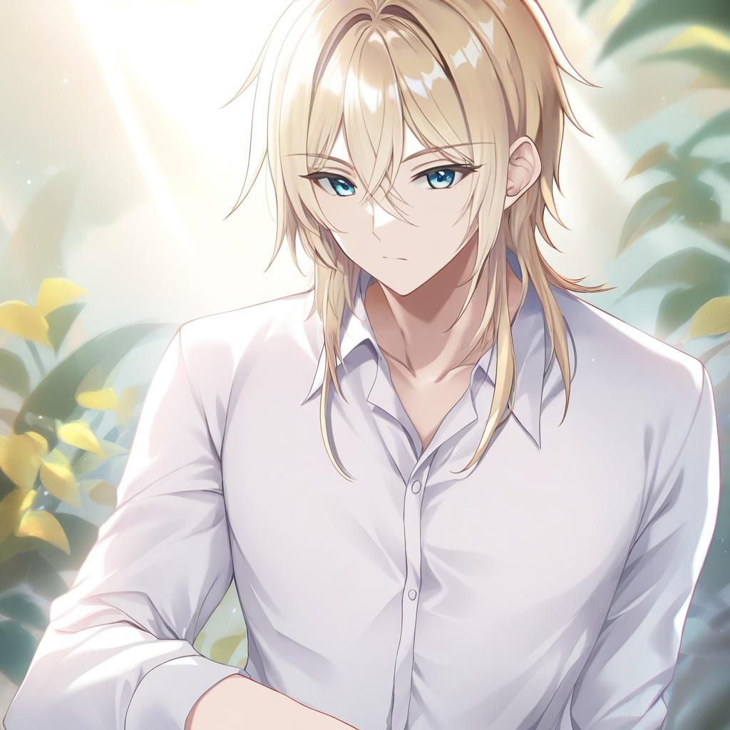 Alkaid mcgrath, lovebrush chronicles, 1boy, hair between eyes, green eyes, blonde hair, medium hair, long hair, white shirt, collared shirt, long sleeves, by artist aak, leet