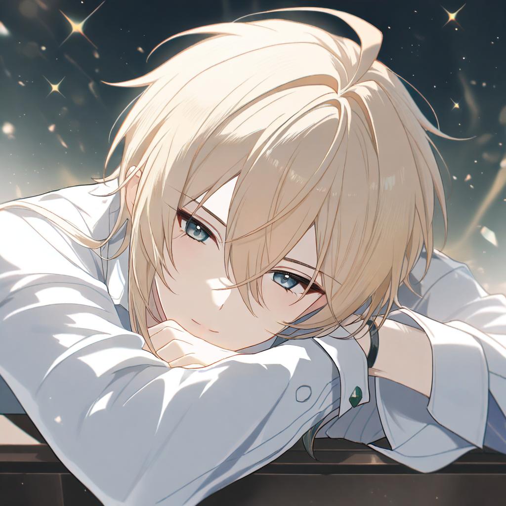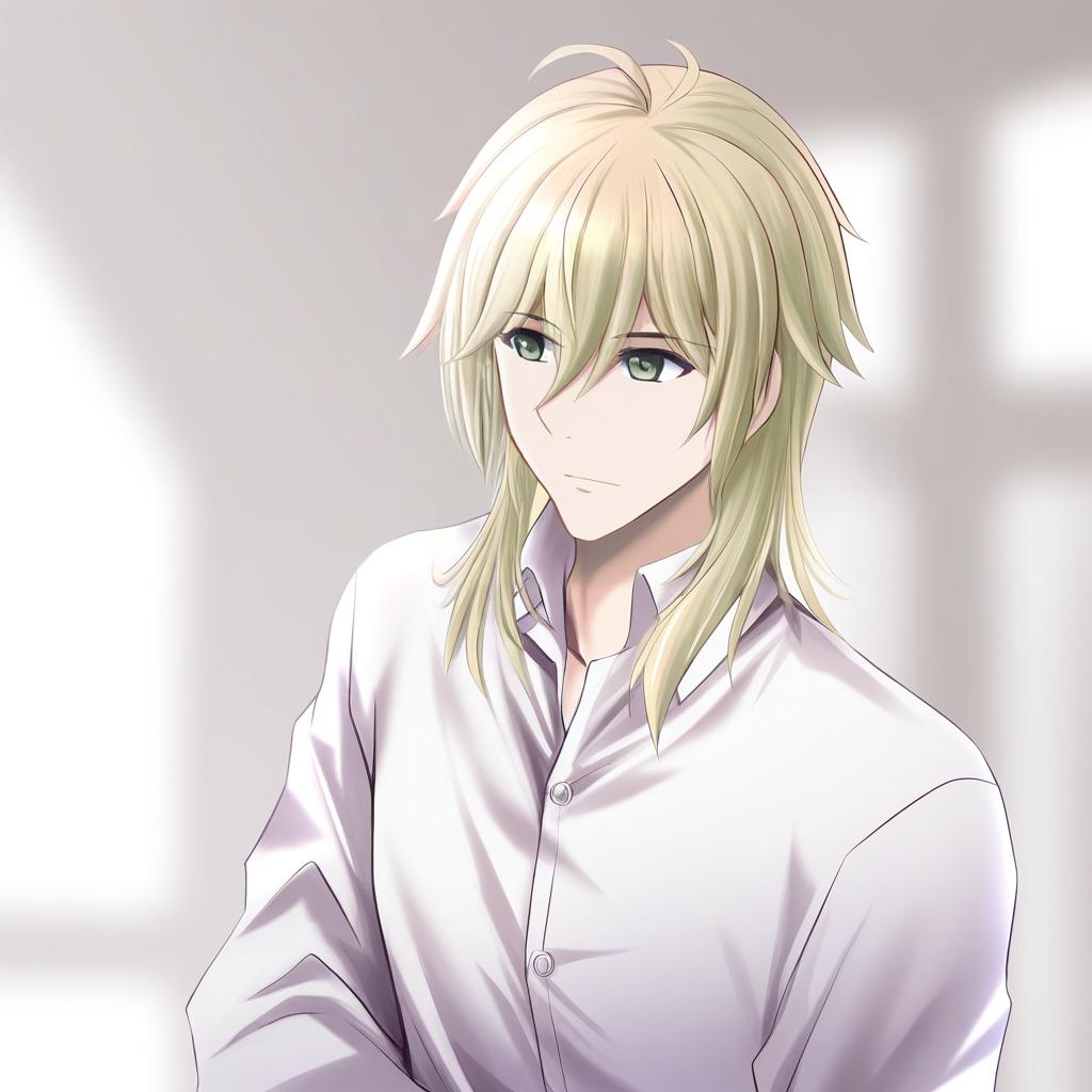 Digital anime-style illustration of a young blonde male character with medium to long hair, green eyes partially covered by hair strands, wearing a white collared shirt with long sleeves. The background is a subtle light gradient, focusing attention on the character's serene expression.
