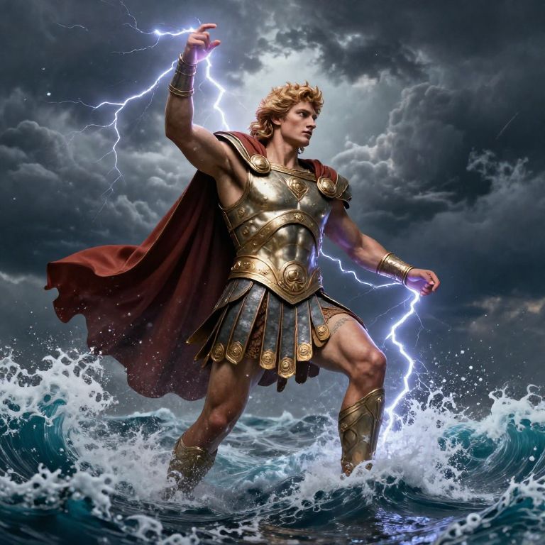 Zeus your son has returned, portrayed as a powerful demi-god emerging from the sea, lightning striking the waves, ancient Greek armor shining, heroic stance against a dramatic stormy sky, epic fantasy artwork with rich colors and textures