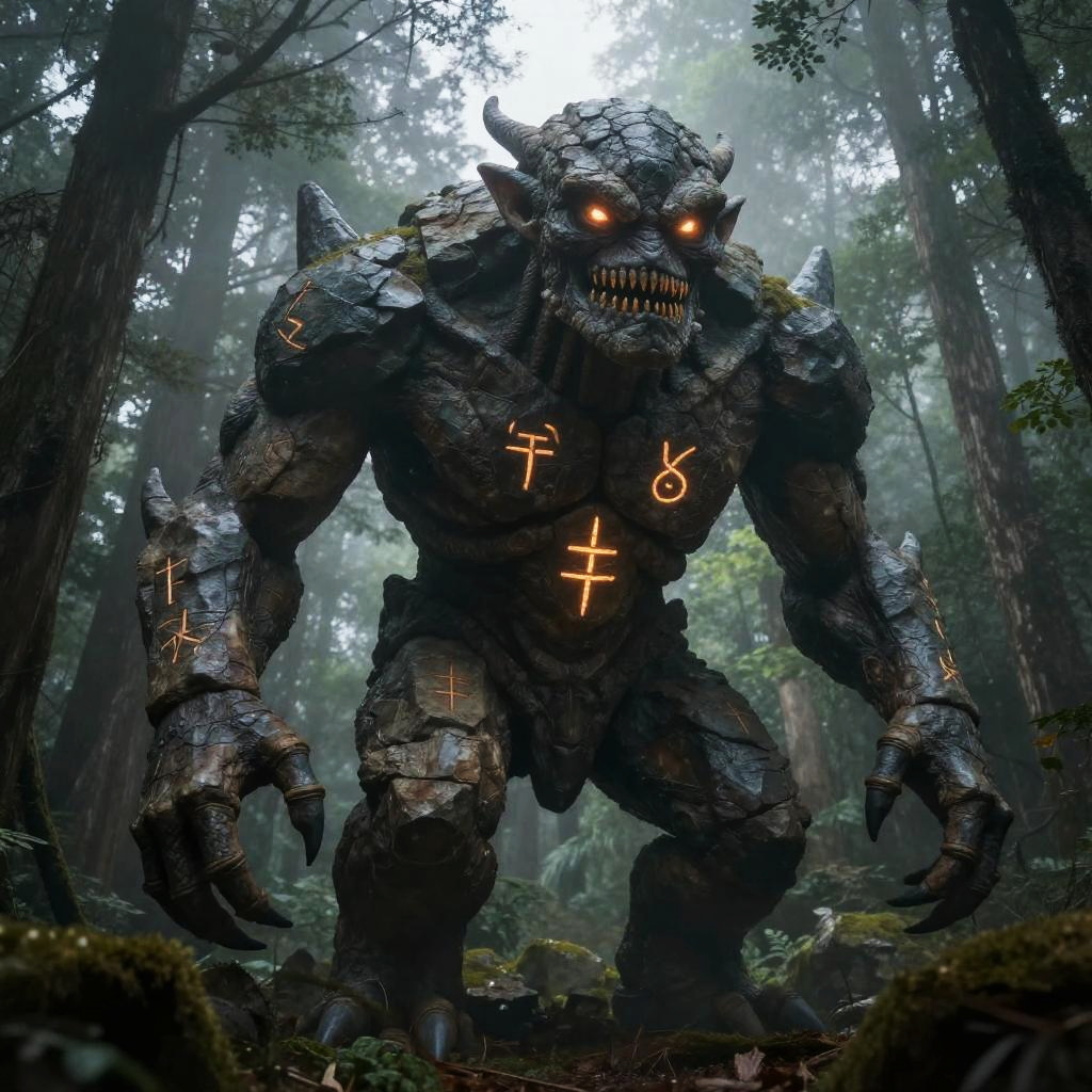 Golem rock monster towering in a misty forest, glowing runes etched on its rugged stone skin, ancient and mystical atmosphere, dramatic lighting