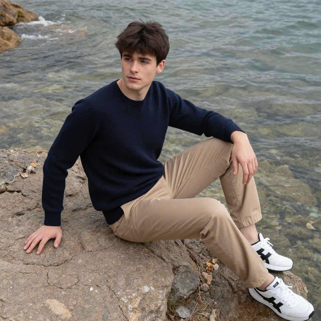 A photograph of a young man with short, dark brown hair and light skin, sitting on a rocky outcrop by the water. He's wearing a navy blue sweater, beige pants, and white sneakers with black accents. His left hand rests on the rock while his right hand is on his knee. The clear water behind him shows small waves and rocks. He's looking slightly to the side with a relaxed expression.
