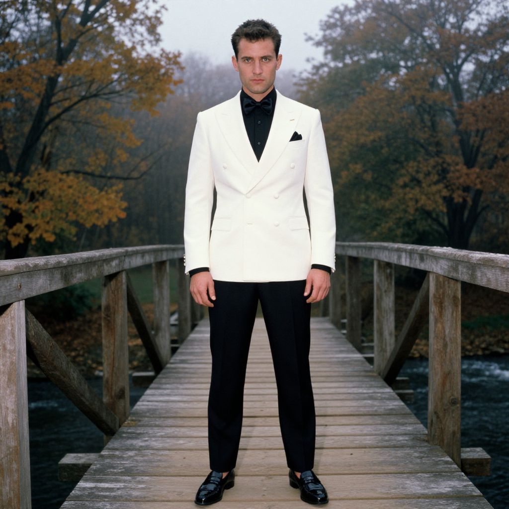A man, chic black dress shirt, double-breasted white tuxedo jacket, black satin bow tie, tailored black dress pants, shiny black loafers, rustic wooden bridge, surrounded by autumn foliage, mist rising from the river below, instant film style, confident expression. Man has masculine face and piercing eyes