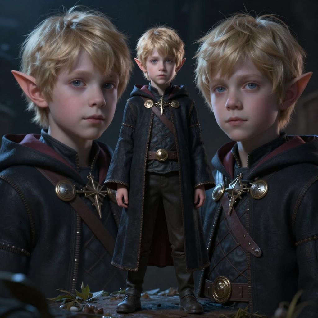 Two elf-like characters with pointed ears, one with short dark hair and the other with a high ponytail, hold a red map. The dark-haired elf looks at the map with a focused expression. Nighttime rocky landscape in the background. Both wear medieval-style clothing. The right character's eyes are intense. Both characters are close together, leaning slightly forward.