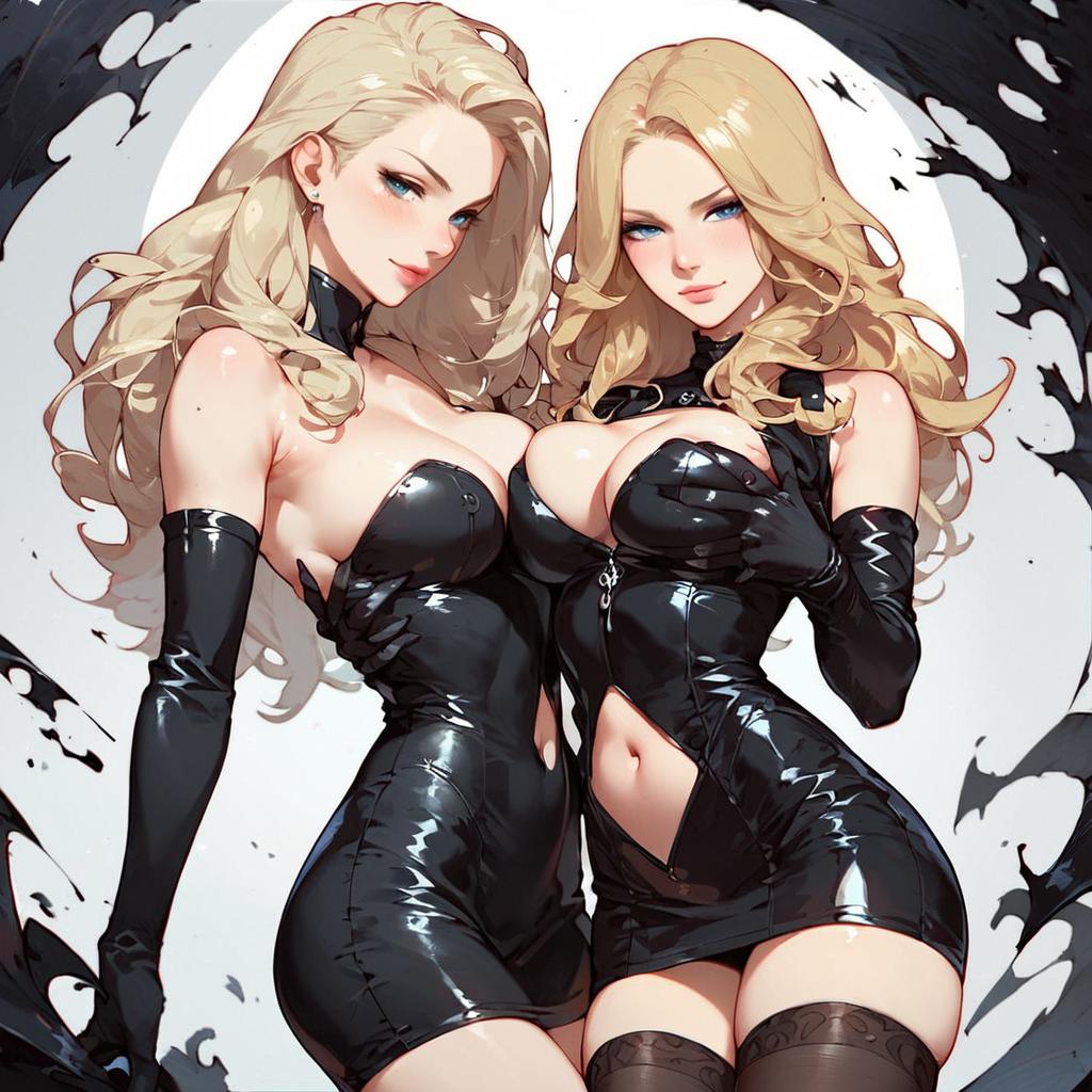 ZPDXL, source_anime, cowboy shot, corrupted Black Canary, DC Comics, blonde hair, blue eyes, black latex princess, stomach cutout, bare shoulders, latex skirt, thighhighs, closed mouth, naughty face, standing, groping