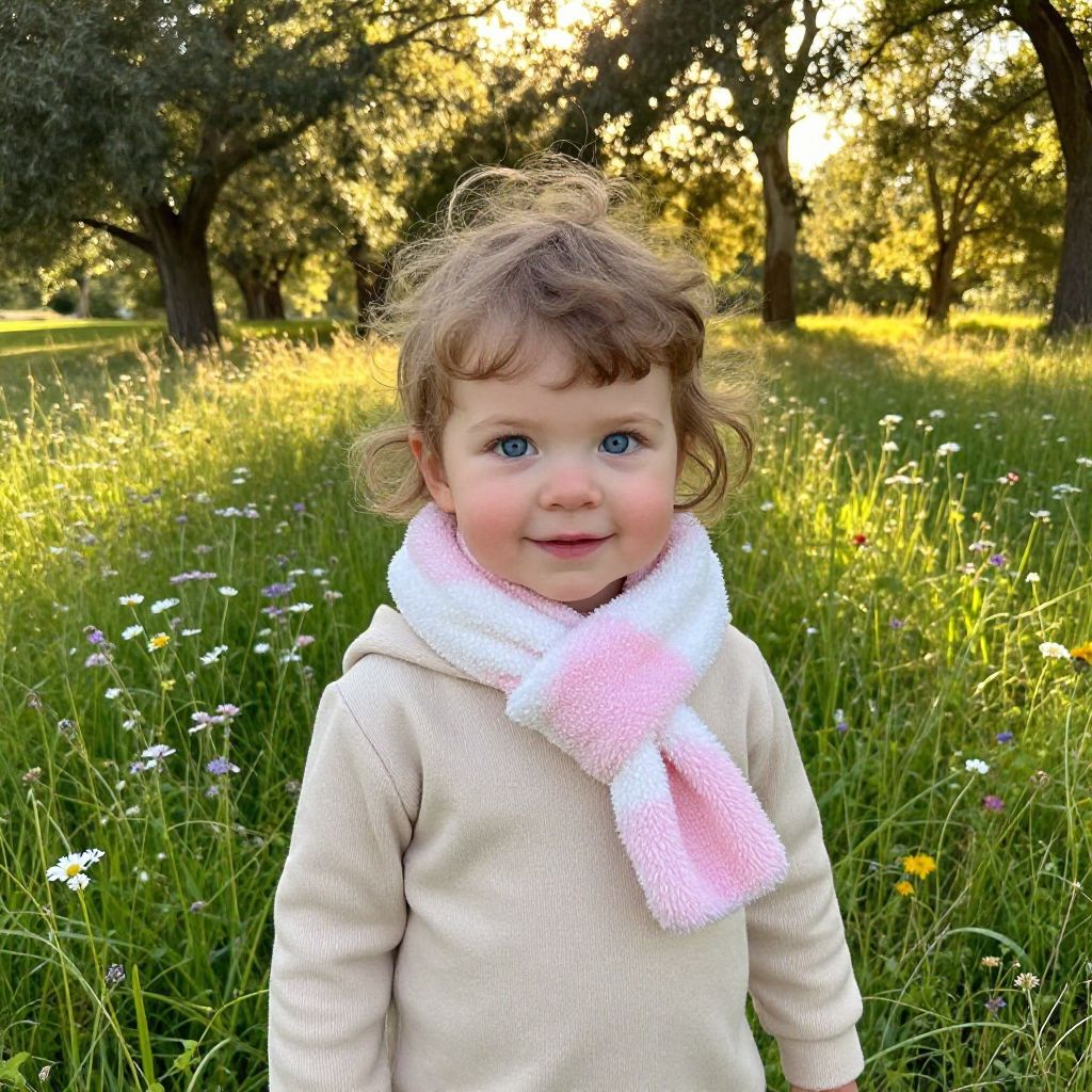 A young child with bright blue eyes, soft curly hair, and a warm, innocent expression, wearing a cozy beige outfit with a hood and a fluffy pink-and-white scarf wrapped around her neck, standing in a sunny meadow with wildflowers blooming in the background, golden sunlight filtering through the tall trees and creating dappled patterns on the grass, the air filled with a peaceful and joyful atmosphere, capturing the simple beauty of childhood wonder and natural harmony.