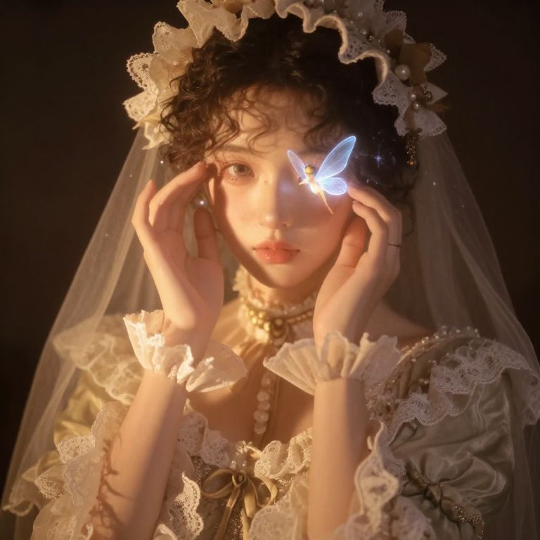 Imagine a hyper-realistic digital art composition depicting an enchanting scene from the viewpoint of a tiny insect perched on the delicate designs of an antique tea service in a dimly lit Victorian drawing room. The subject is a cryptic female figure with smooth alabaster skin and dark, flowing hair partially concealed by a lace shroud. She stands near an expansive window, her outline defined against the moonlit sky beyond. Her eyes shimmer under the faint glow of an old gas lamp, revealing a captivating depth that entices the observer. As the room is bathed in the soft, shifting light from the flickering flame, the ambiance exudes a haunting yet mesmerizing aura, drawing the audience into this mysterious and elegant realm.