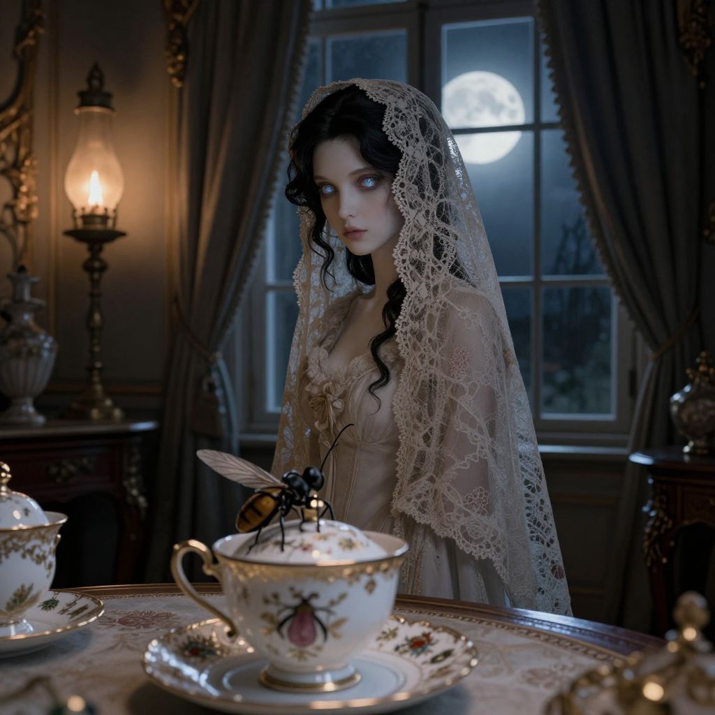 This is a digital painting in a gothic, Victorian style. It features a pale-skinned woman with dark, wavy hair and striking blue eyes, wearing a delicate, lace veil over her head. She stands in an ornately decorated room with dark brown curtains and a window showing a full moon. She is dressed in a light beige, lace-trimmed dress with floral embroidery. In front of her is a table set with an intricate white teacup adorned with a floral design, a teapot, and a lace tablecloth. A black insect-like figurine with wings rests on the teacup. A lit candle on the left adds a warm glow.