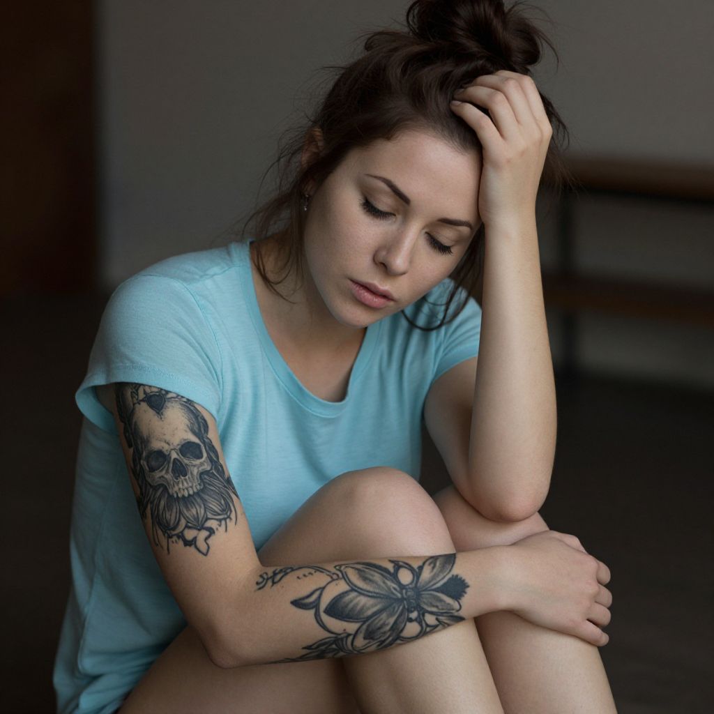 Photograph of a tattooed woman with dark hair in a bun, wearing a white lace tank top, arms raised, showcasing colorful arm and back tattoos