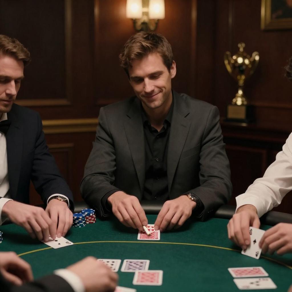 Photograph of three men playing poker in a dimly lit room. Central man, wearing dark suit and black shirt, holds a cigarette in right hand, smiling slightly. Left man, in dark suit, looks at him. Right man, partially visible, holds poker cards. Poker chips and cards on table. Warm lighting, wooden background, trophy in background.