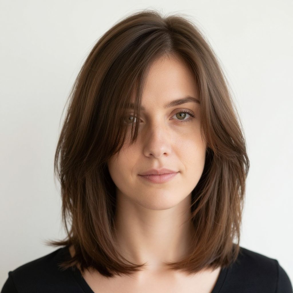 Caucasian woman with layered shoulder-length cut hairstyle, a balanced and easy-to-maintain look that showcases volume and structure. Her hair flows gently in natural light, emphasizing the seamless blend of layers and texture. Clean, realistic composition with subtle facial features and a relaxed, everyday setting.