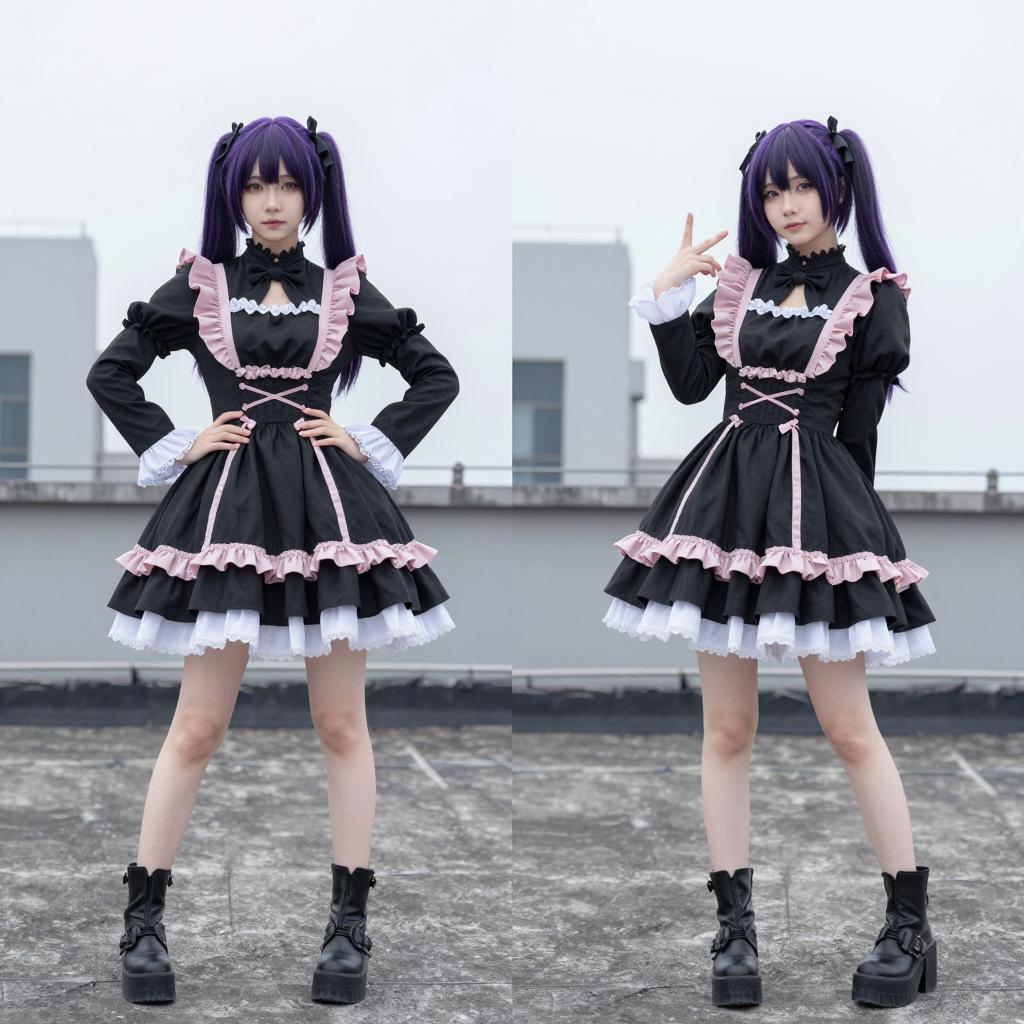 Asian woman with long black hair and purple streaks in a ponytail, wearing a black gothic dress with pink ribbons and frills, black boots, and holding a sword in her right hand, standing on a rooftop with a cloudy sky background. She holds a black object in her left hand, standing with a confident posture. Her facial expression is neutral. The rooftop has concrete surfaces and some debris. The visual style is photographic realism.