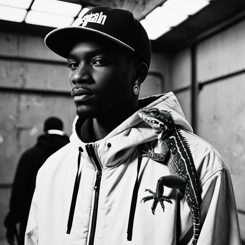 Black and white fashion photograph of a black male model wearing a white zip-up jacket and a black cap with text. The model has a lizard perched on his shoulder. He is indoors, with industrial walls and ceiling lights visible in the background. The model also wears a distinctive earring, contributing to a futuristic hip-hop style.
