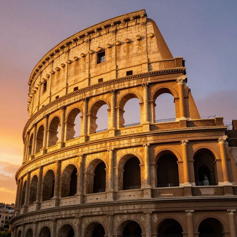 Colosseum background at sunset, warm golden light casting dramatic shadows on the ancient stone architecture, with a soft orange and purple sky, cinematic and highly detailed.