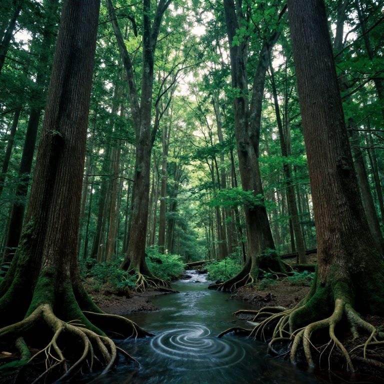 Photograph of a serene forest scene with a narrow, winding stream at the center, reflecting light ripples. Tall, majestic trees with thick, textured bark and sprawling roots dominate the composition. Dense, vibrant green foliage filters sunlight, creating a dappled light effect. The forest floor is covered in brown leaves and underbrush. The stream, dark and reflective, meanders through the center, surrounded by lush greenery. The background fades into a dense canopy, giving a sense of depth and tranquility. The overall color palette is rich with greens and browns, evoking a peaceful, natural atmosphere.