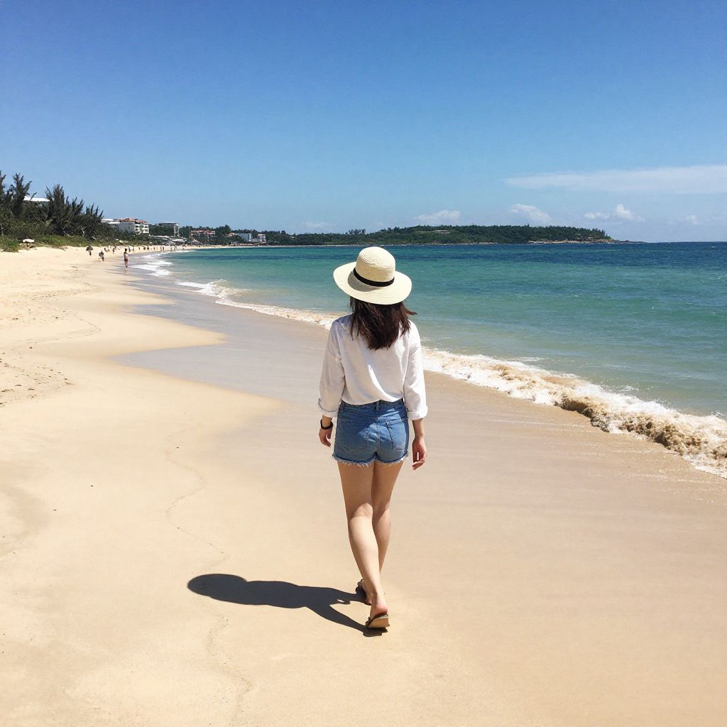 Woman walking along a pristine sandy beach, her back turned as she strolls toward the turquoise sea under a clear blue sky, with distant buildings and greenery lining the horizon.