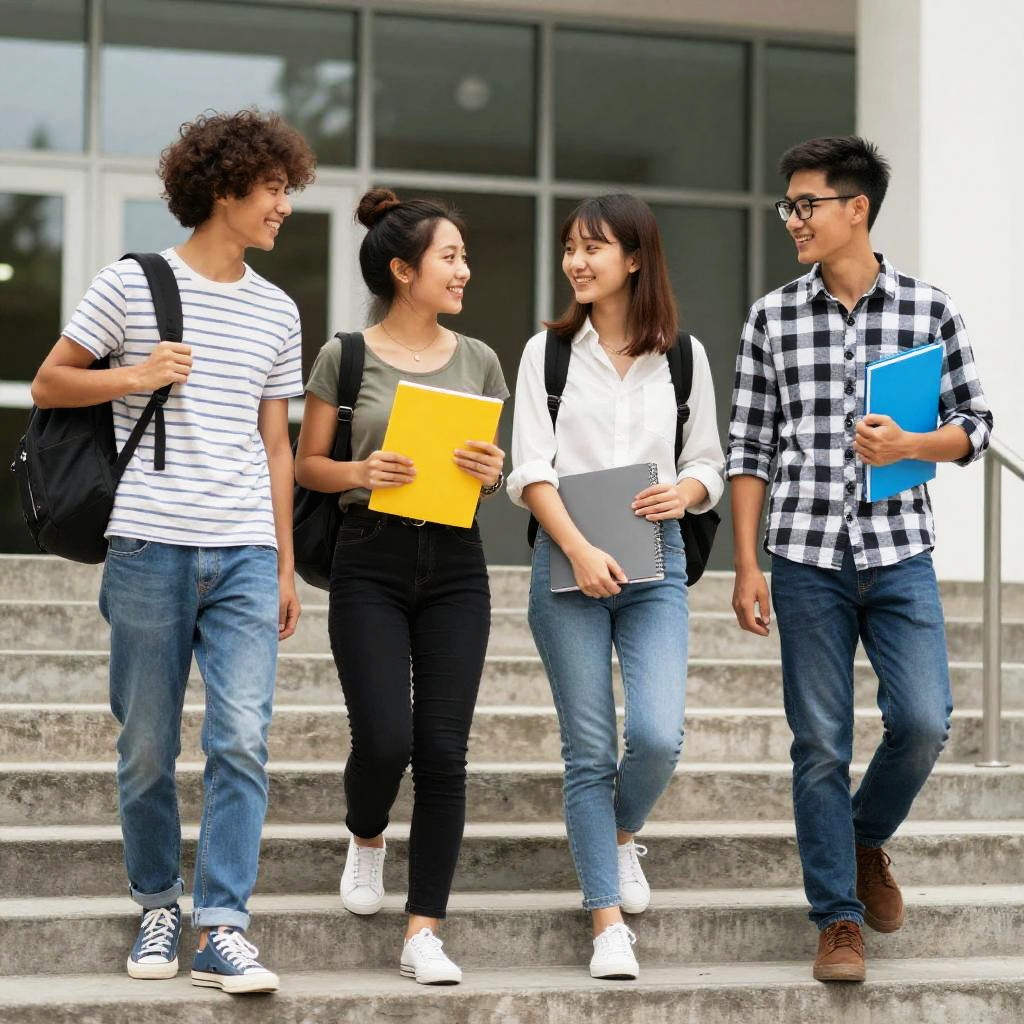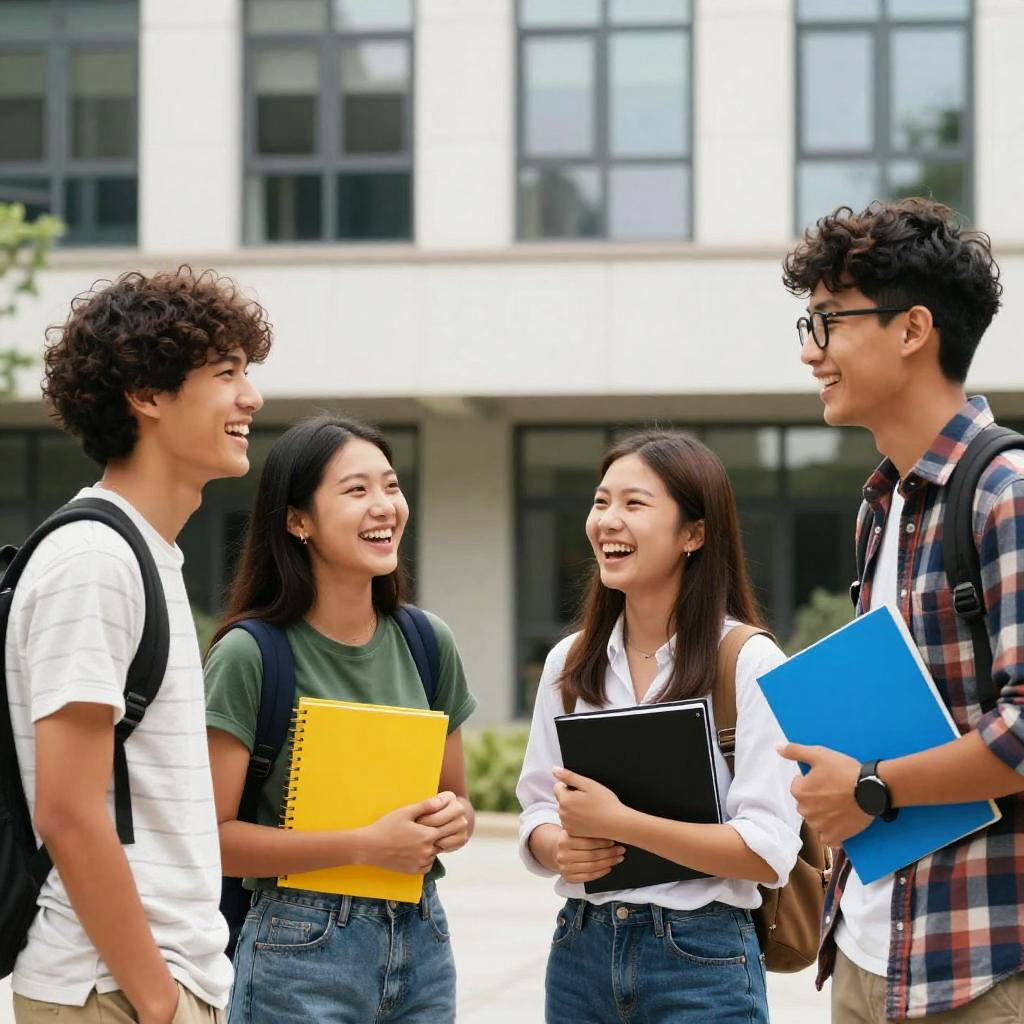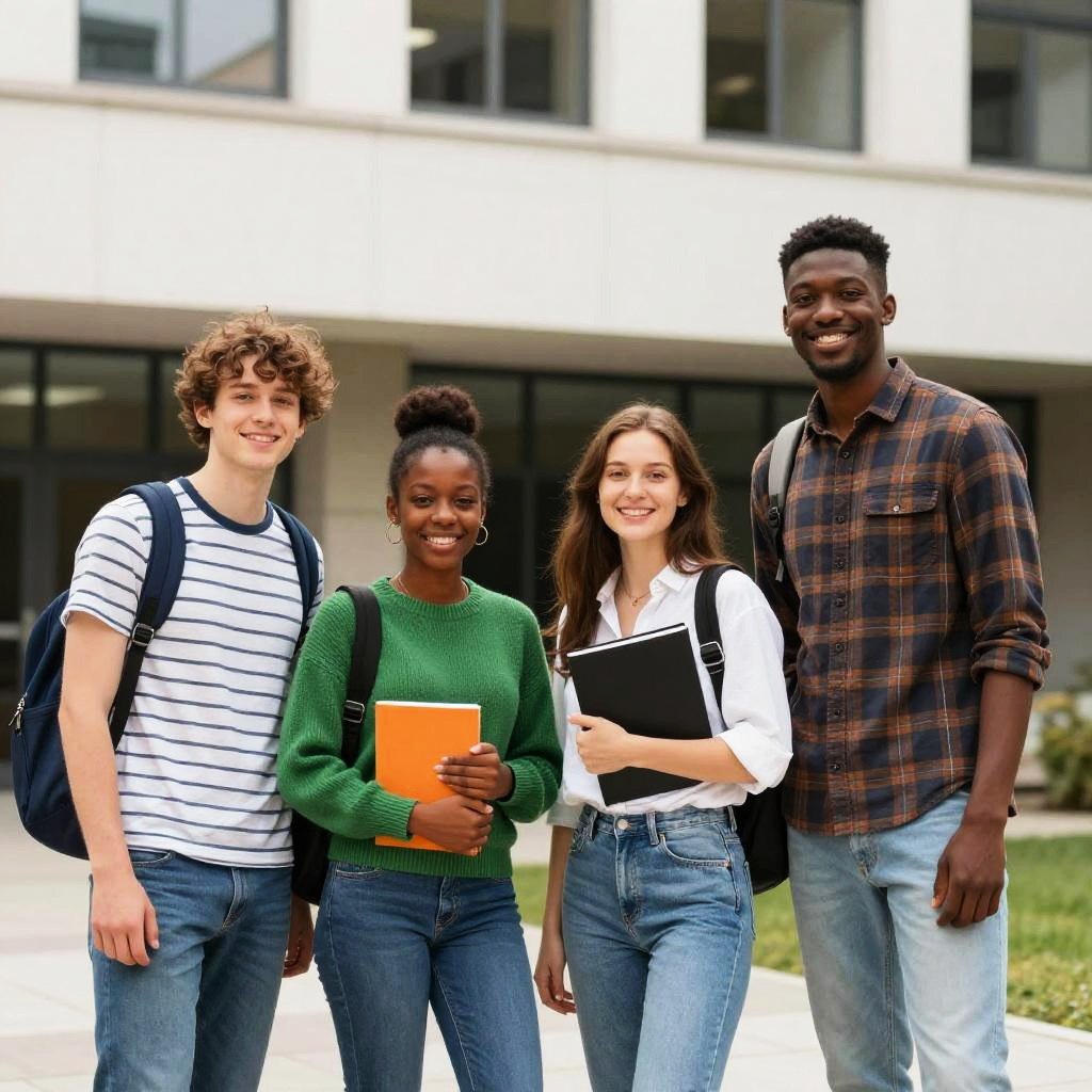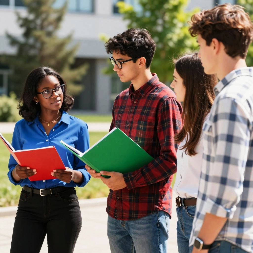 Photograph of five diverse college students sitting on a grassy park field, laughing and chatting. They're dressed casually in jeans and sweaters, with backpacks nearby. A dark-skinned male in a plaid shirt leans forward, while a white male with curly hair in a striped sweater sits in the middle. Bright sunlight filters through trees in the background.
