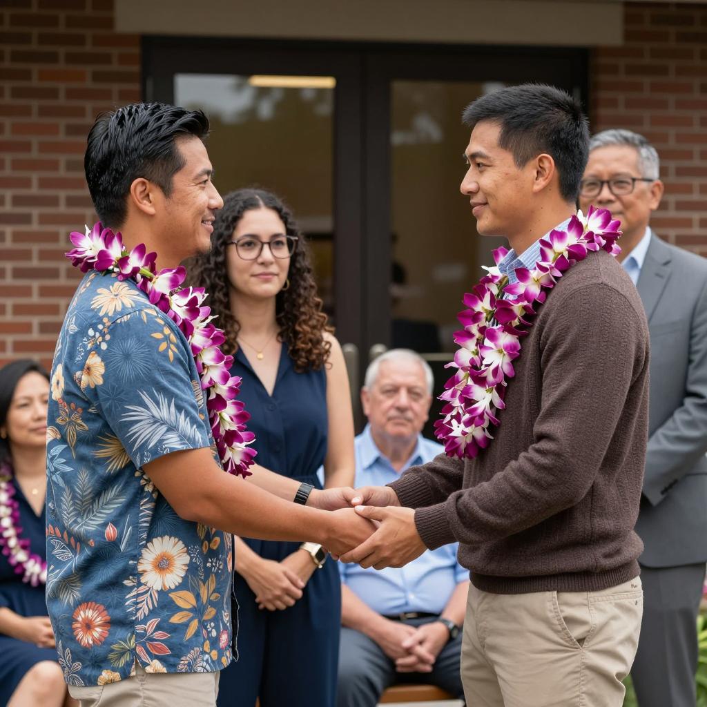 Photograph of a smiling female naval officer in a white uniform and black-and-white hat, standing behind a smiling male naval officer in a white uniform with medals. Background shows seated people. Female officer's hand on male officer's shoulder. Male officer's dark hair, light skin, and broad face. Female officer's light skin, dark hair, and bright smile. Casual, indoor setting.