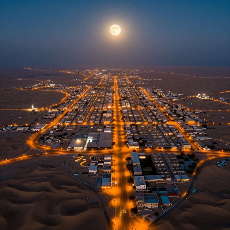 Aerial photograph of a desert town at night, illuminated by a full moon in a clear, deep blue sky. The town's streets, glowing with bright orange streetlights, form a grid pattern leading to a central intersection. Buildings with illuminated windows are scattered throughout, creating a contrast against the dark, sandy landscape. The moonlight casts a soft glow on the town, highlighting the network of roads and adding a sense of depth and perspective. The image captures the serene yet vibrant atmosphere of the desert town under moonlight.