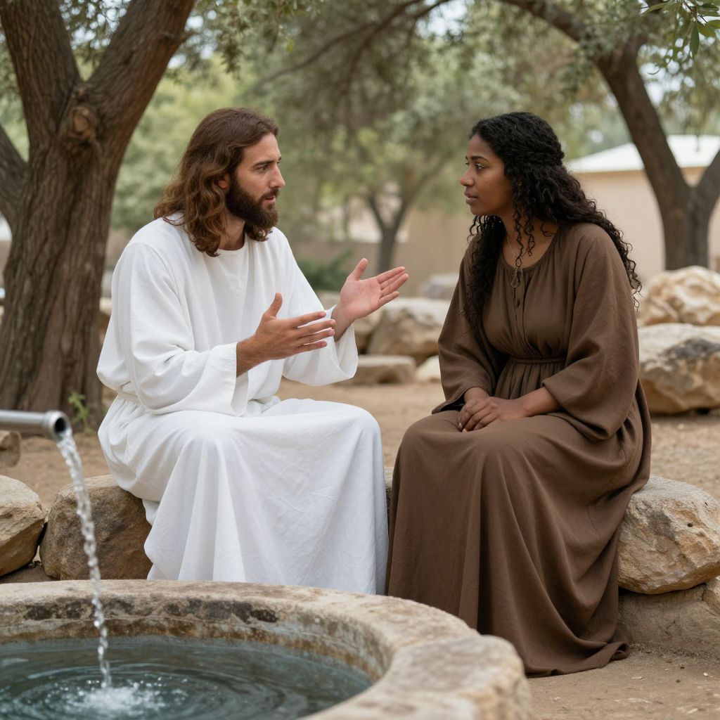 Jesus sits by Jacob's Well near Sychar, engaging in a profound conversation with a Samaritan woman, as He explains the concept of \"Living Waters,\" symbolizing spiritual life, while the serene backdrop of trees, rocks, and flowing water enhances the sacred moment.