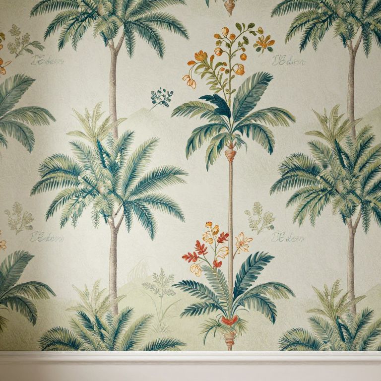This photograph captures a wallpaper with a tropical botanical design. The wallpaper features tall, slender palm trees with lush, green fronds, interspersed with various flowering plants and small shrubs. The colors are predominantly shades of green, yellow, orange, and red, set against a light, creamy background. The botanical illustrations are detailed and realistic, reminiscent of 18th-century botanical prints. The wallpaper is adorned with subtle, cursive text in a light gray color, adding an elegant touch. The bottom edge of the image shows a white baseboard, indicating that the wallpaper is covering a wall. The overall style is vintage and tropical, evoking a sense of lush, exotic vegetation.