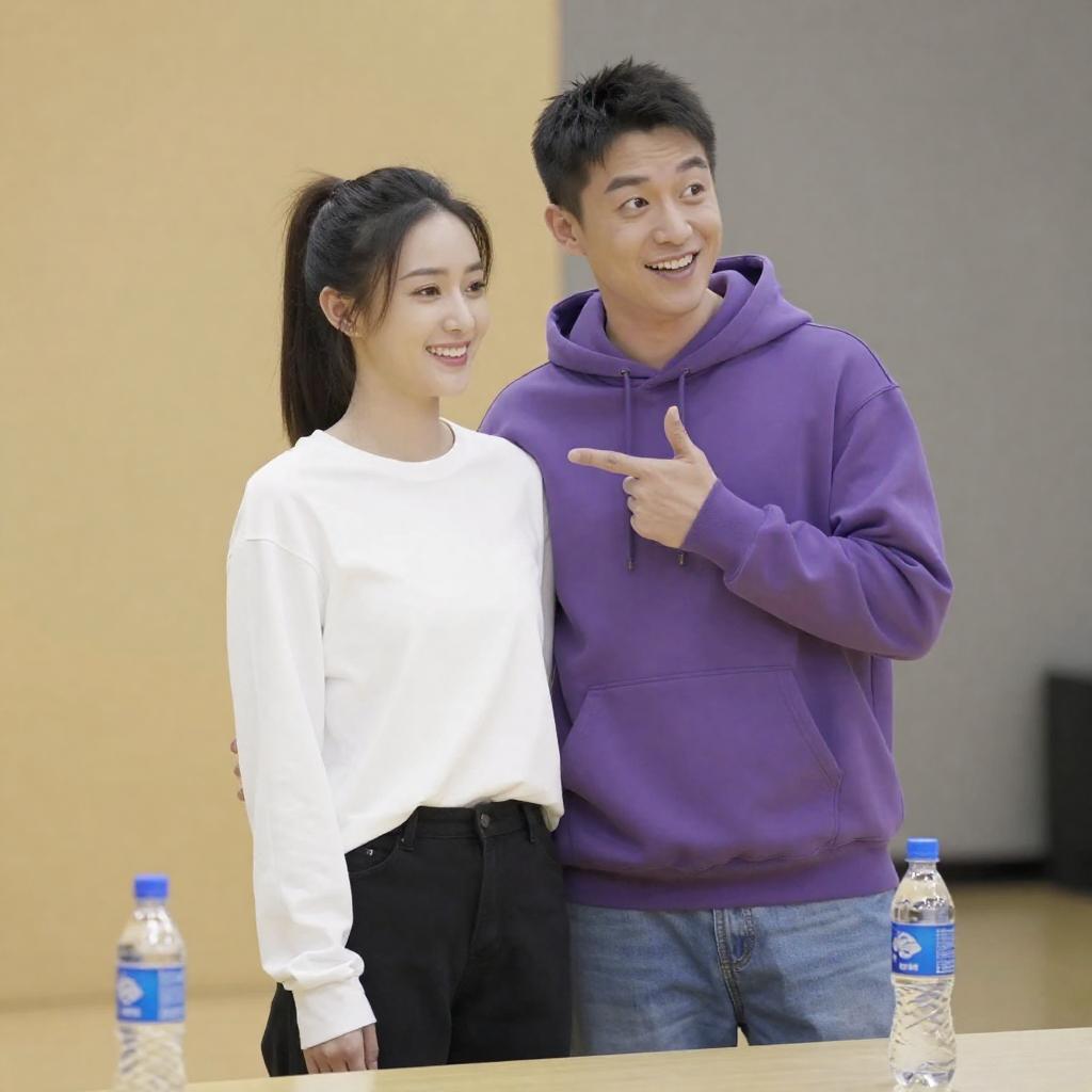 A young Asian couple smiling and standing close together indoors. The woman has long dark hair tied in a ponytail and is wearing a white long-sleeve shirt with black pants. The man wears a purple hoodie and blue jeans, pointing playfully at the woman. Two water bottles are placed on a table in front of them. The background features a yellow and gray wall with a blurred effect.