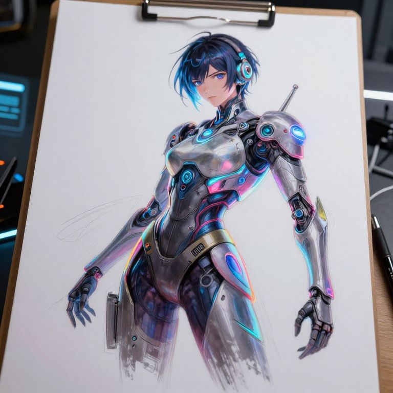 Anime drawing AI creating a futuristic character sketch, glowing neon highlights with dynamic pose, digital brush strokes blending vibrant colors and intricate details, set in a high-tech virtual studio environment, cinematic lighting and sharp focus