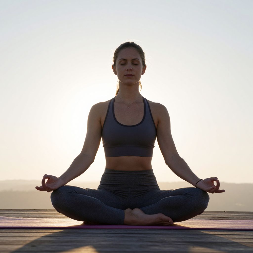 Silhouetted photograph of a woman in black sports bra and leggings, sitting cross-legged in meditation pose on a wooden deck at sunset.