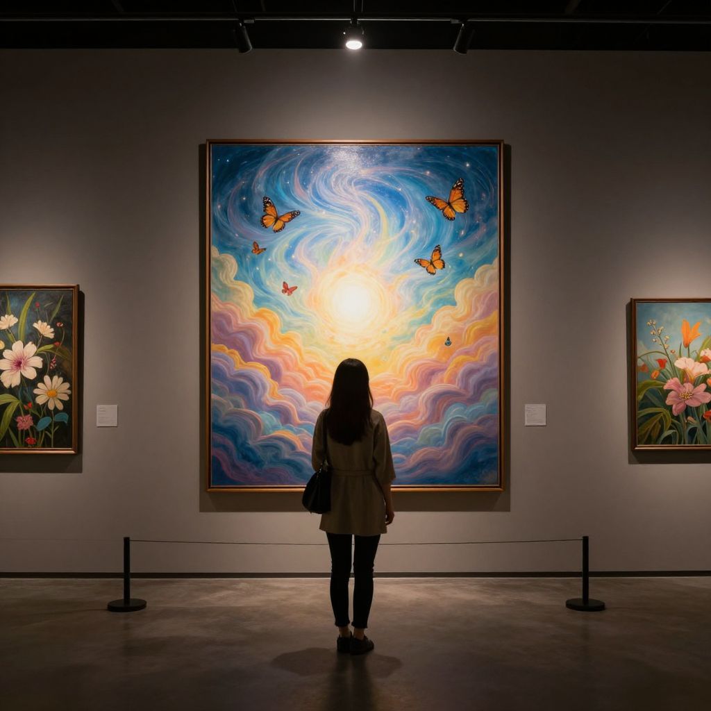 Woman observing a surreal, luminous painting of a radiant sky with swirling clouds and butterflies, illuminated by spotlights in a dimly lit gallery space flanked by floral artworks.