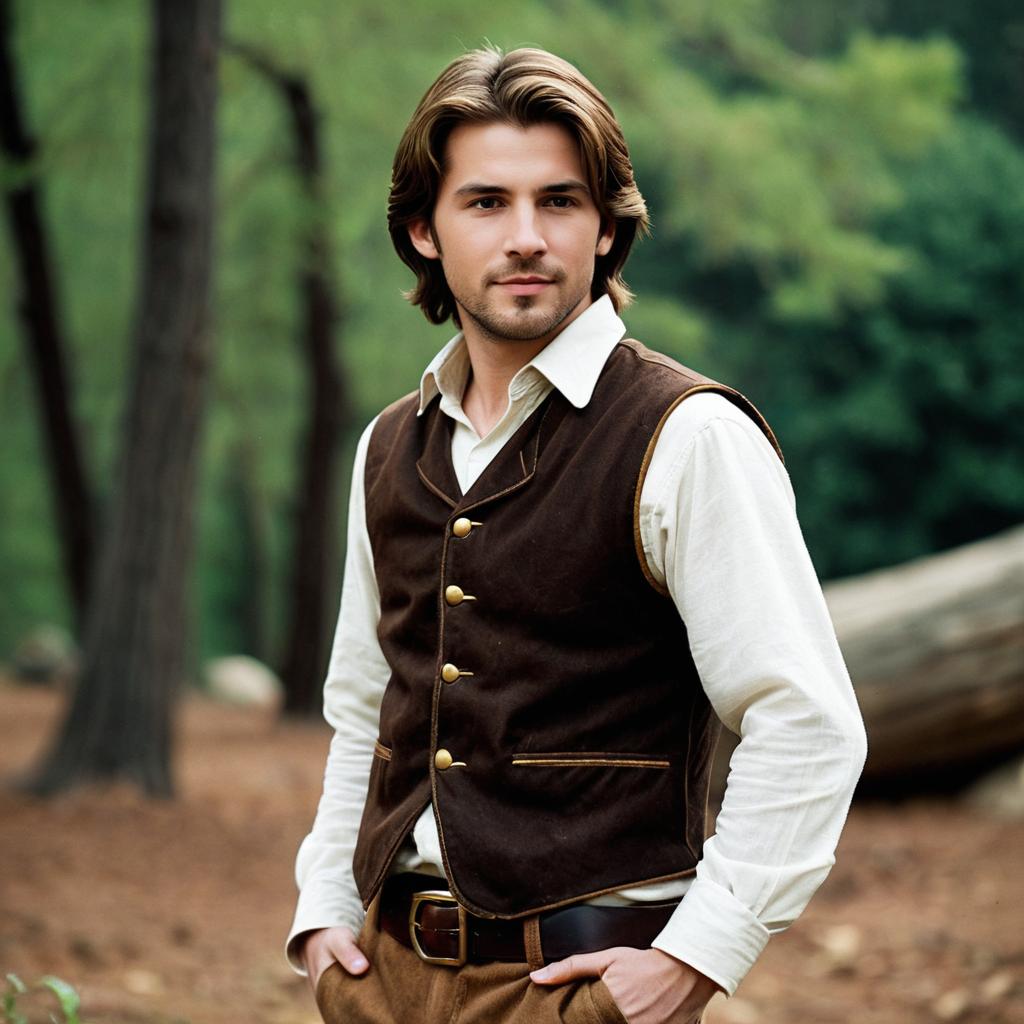 France national costume man,male focus, 1boy, outdoors, brown pants, pants, vest, looking at viewer, realistic, solo focus, coat, shirt, brown hair, short hair, white shirt, closed mouth