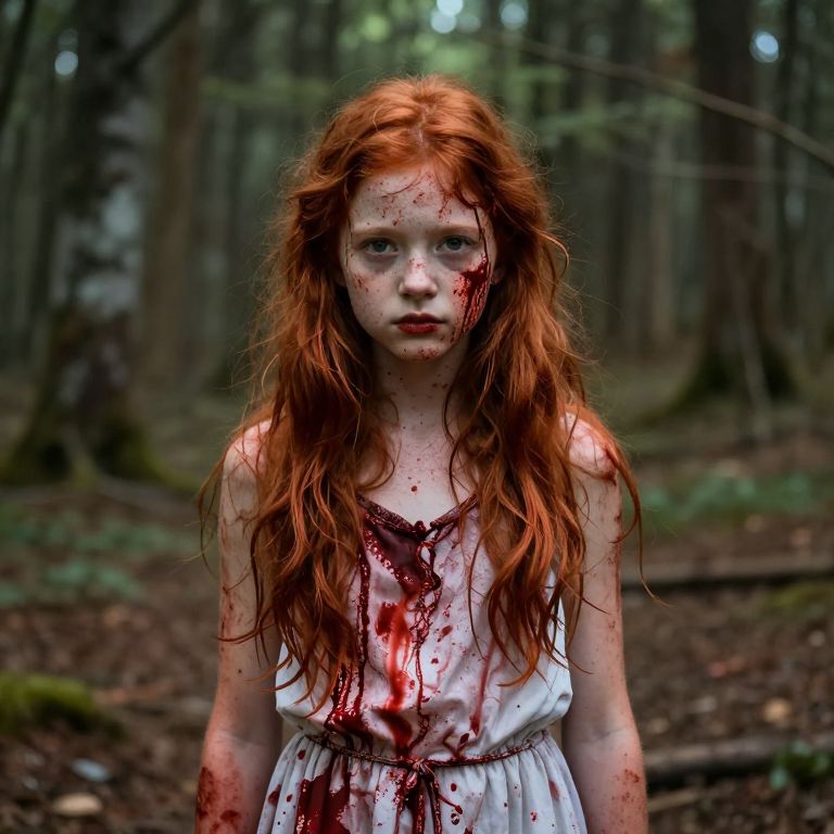 Photograph of a young red-haired girl with pale skin standing in a dark, dense forest. She has long, messy red hair and is wearing a white, sleeveless dress stained with blood, particularly on her chest and hands. Her face is smeared with blood, and she has a somber, fearful expression. The background shows blurred trees and forest floor, creating a mysterious and eerie atmosphere. The image has a high-contrast, slightly surreal style, emphasizing the girl's blood-stained appearance.