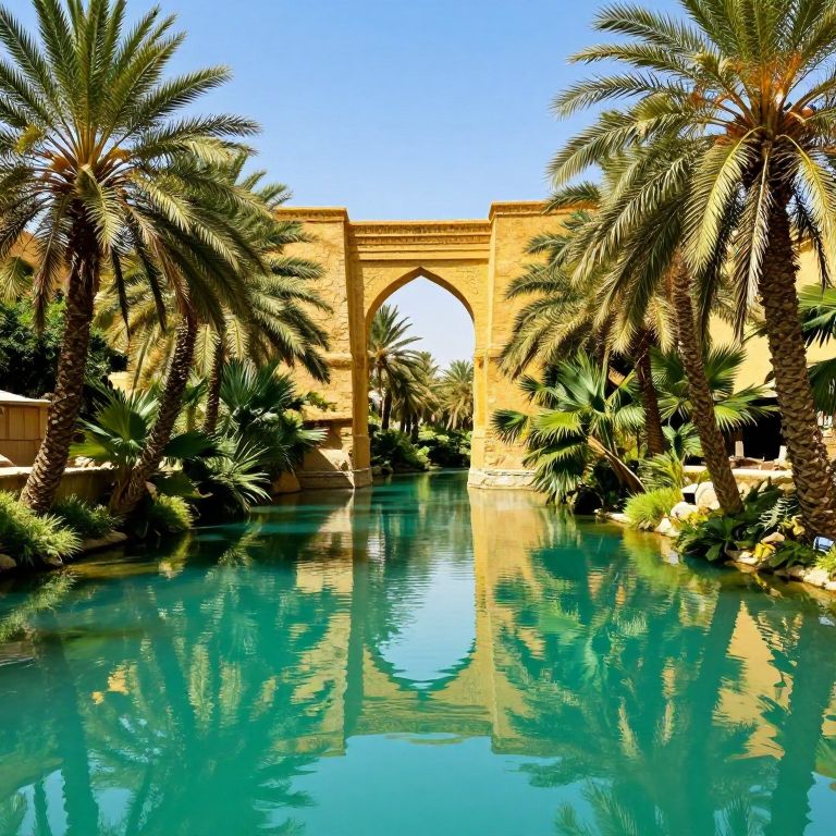 Photograph of a serene, sunlit oasis featuring a turquoise pool with a perfect mirror reflection. The pool is bordered by lush palm trees and various green shrubs. In the background, a tall, tan, arch-shaped stone structure stands prominently under a clear, bright blue sky. The sunlight casts sharp shadows, enhancing the textures of the stone and palm leaves. The overall composition creates a tranquil, exotic, and inviting atmosphere.