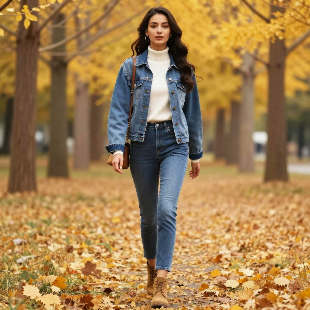 A stylish young woman strolls through a picturesque autumn landscape, dressed in a trendy denim outfit. The golden leaves create a warm, inviting atmosphere, highlighting the beauty of fall fashion against a colorful backdrop.