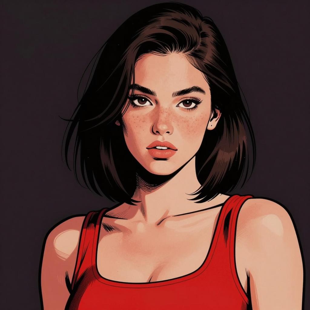 A portrait of a young woman with medium-length dark hair and freckles, wearing a red sleeveless top, intense gaze, bold comic illustration style with vivid colors and strong shading, graphic pop art influence, dark background