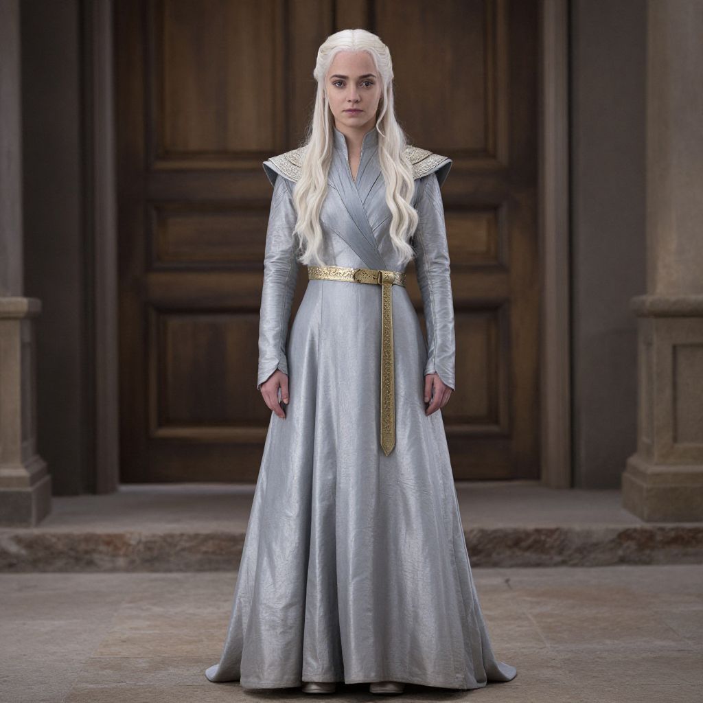 Photograph of a woman with long, straight, platinum blonde hair standing in front of a large, dark wooden door. She wears a long, silver, satin dress with long sleeves and gold trim on the shoulders, cinched at the waist with a gold belt. The dress has a slight sheen and flows to the ground. She has pale skin and a serious expression. The background includes stone columns and a stone pavement. The overall style is medieval or fantasy-inspired, with a focus on metallic and regal elements. The lighting is even, highlighting the texture of the fabric and her hair.