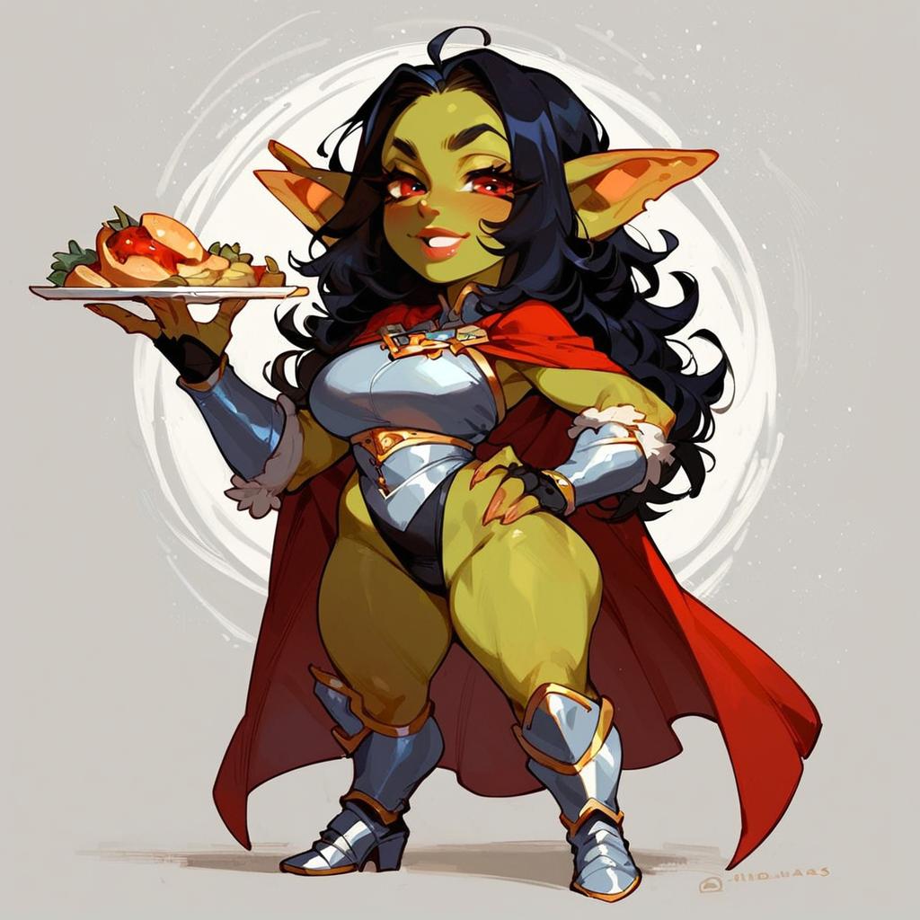 Score_9, score_8_up, score_7_up, rating_questionable, fantasy, source_anime, 1girl, female goblin, cute, (short:1.2), (small:1.2), (shortstack:1.3), large breasts, thick thighs, character sheet, multiple views