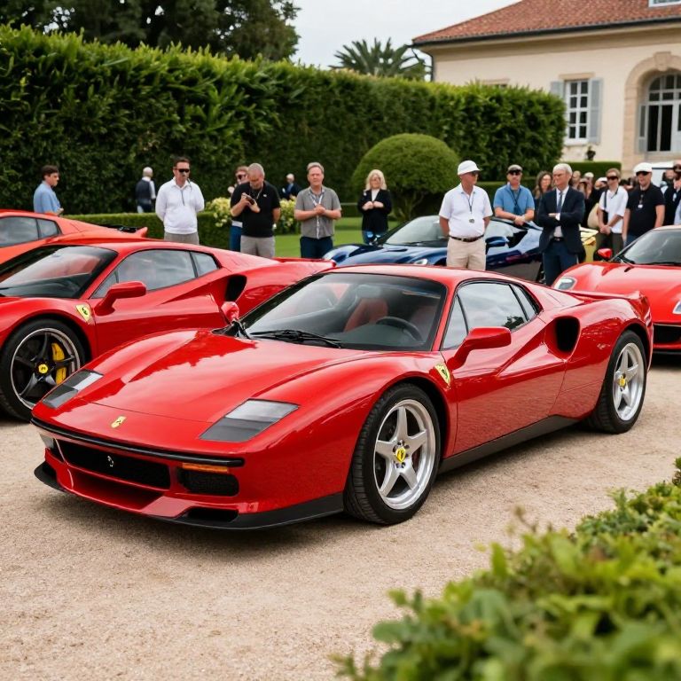 Red Ferrari 288 GTO showcased prominently in front of a gathering of spectators and other luxury vehicles, set against a backdrop of manicured greenery and classical architecture.