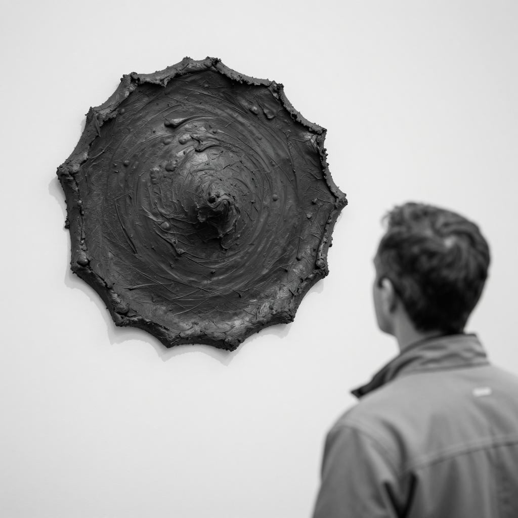 Black and white photograph. A man with short hair, seen from the back, observes a large, dark, ured, shapeless mass on a white wall. The mass is smeared and has a rough ure. The man wears a light-colored jacket.